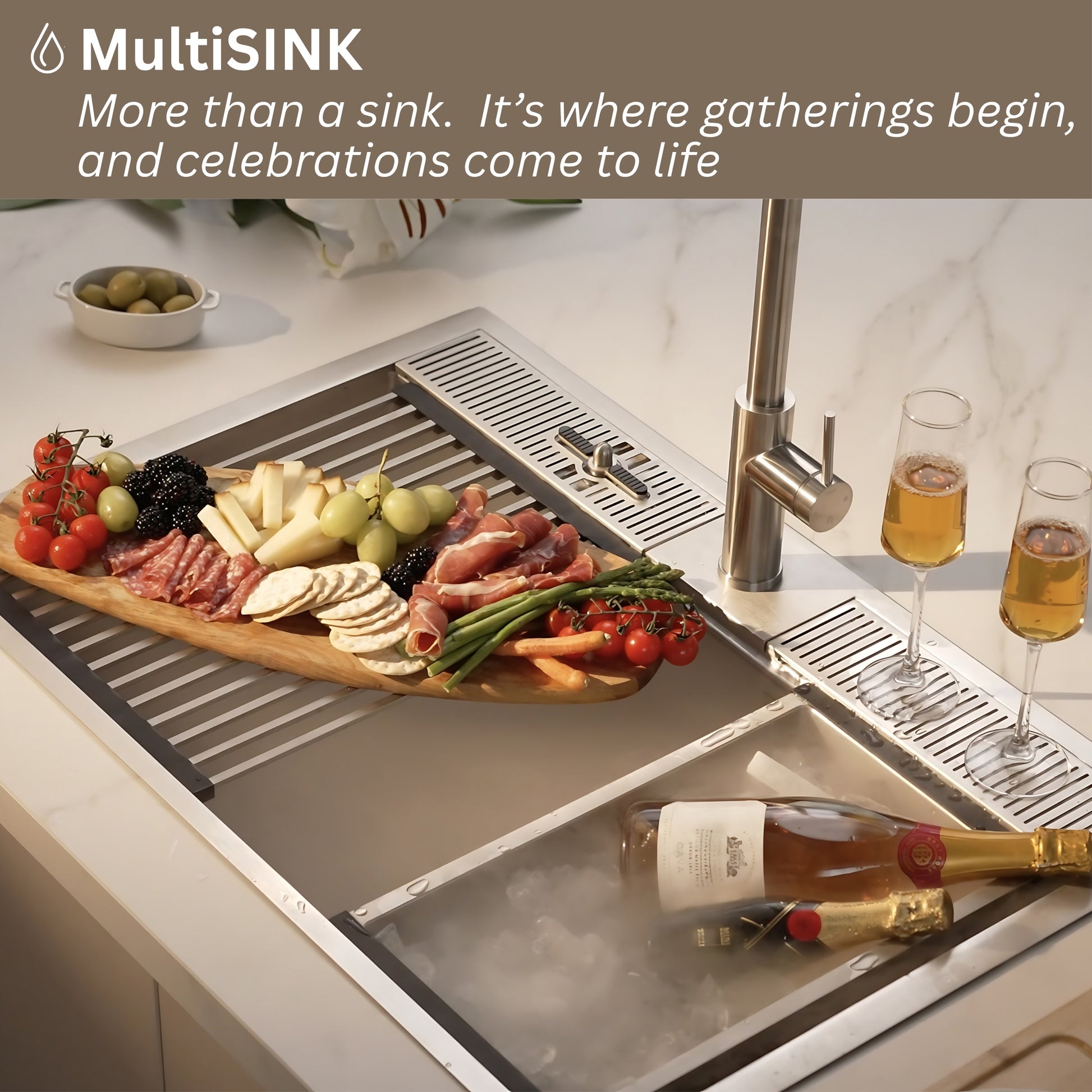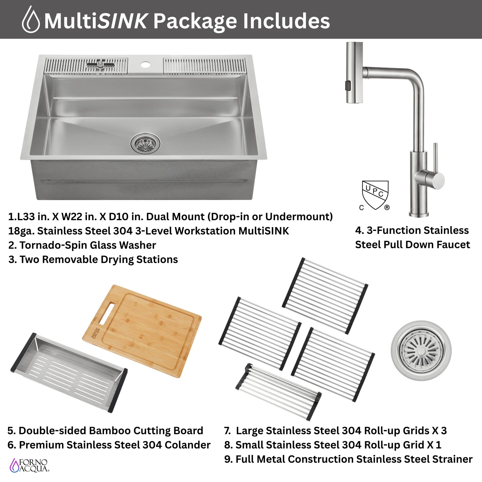 FORNO ACQUA 33 in. Drop-In/Undermount 3-Level Workstation Sink with Waterfall Faucet & Glass Rinser
