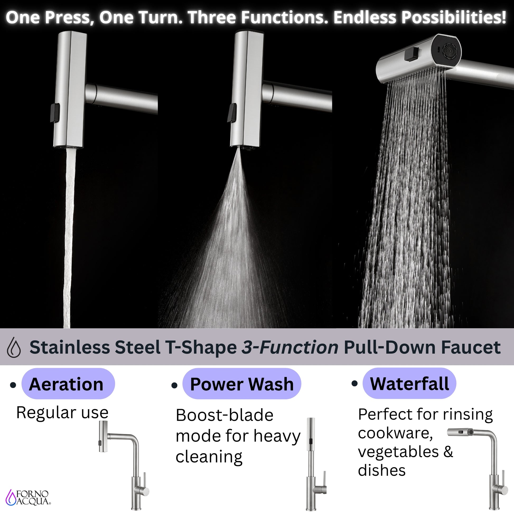 * 3-Function Stainless Steel Pull Down Faucet Combines Wide Waterfall Rinse with Powerful Boost Blade Cleaning