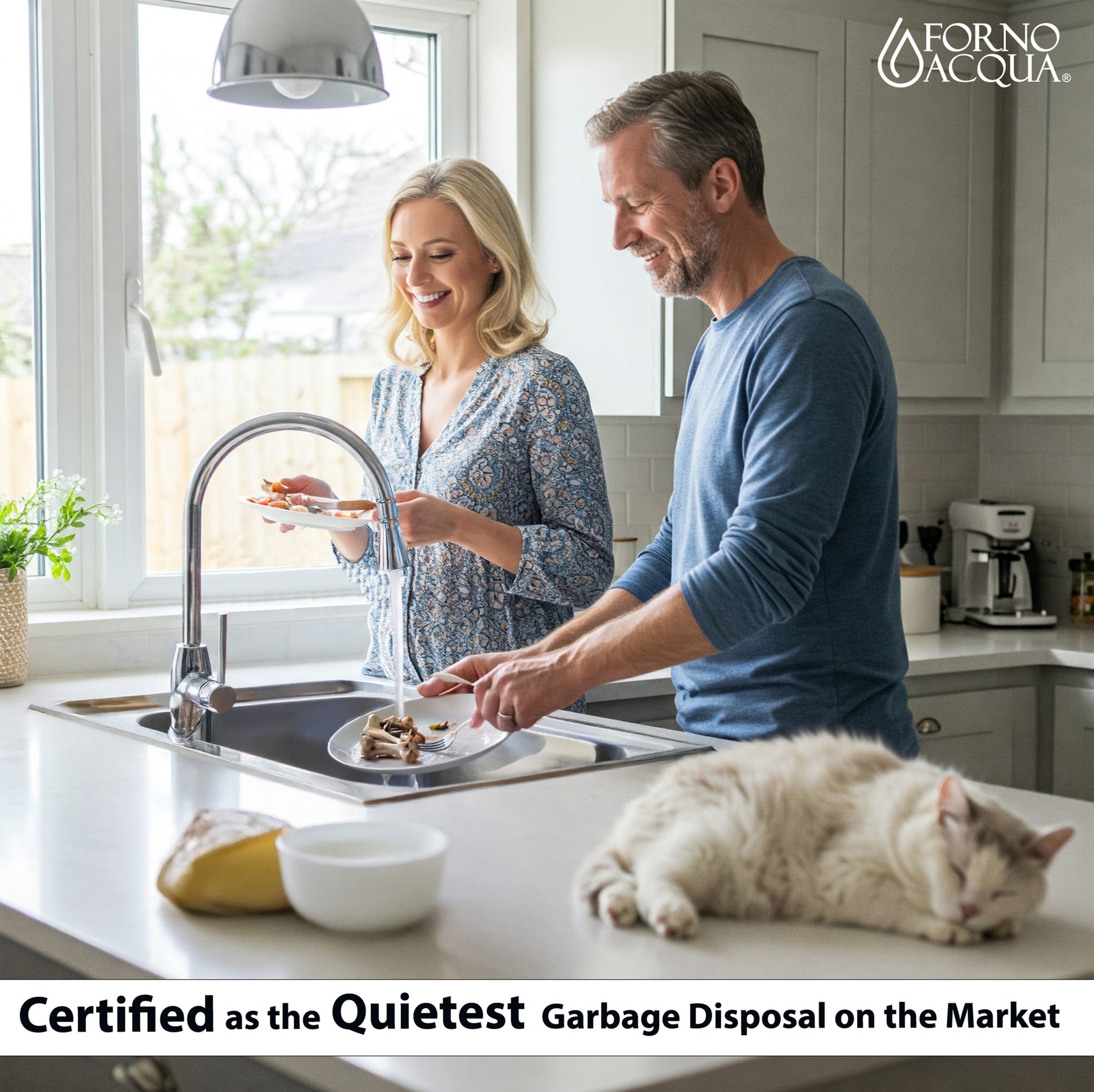 Upgrade your kitchen with the FORNO ACQUA Super Quiet Waste Disposer, a perfect blend of power, elegance, and advanced design. Featuring a permanent magnet motor, it delivers fast, efficient grinding for food waste while operating whisper-quiet for a more peaceful kitchen experience. The innovative BrightDIAMOND 270º Motion-Activated LED Cabinet Light surrounds your cabinet with a stunning cool blue glow, combining modern style with practical lighting to perform chores. Thoughtfully designed, it comes with a pre-wired air switch and plug-in cord, making installation a breeze and using it a pleasure. Built for performance and durability, FORNO ACQUA ensures your kitchen stays clean, functional, and sophisticated. Experience cutting-edge technology, premium craftsmanship, and a touch of brilliance. BrightDIAMOND where lighting and innovation meets garbage disposal excellence.