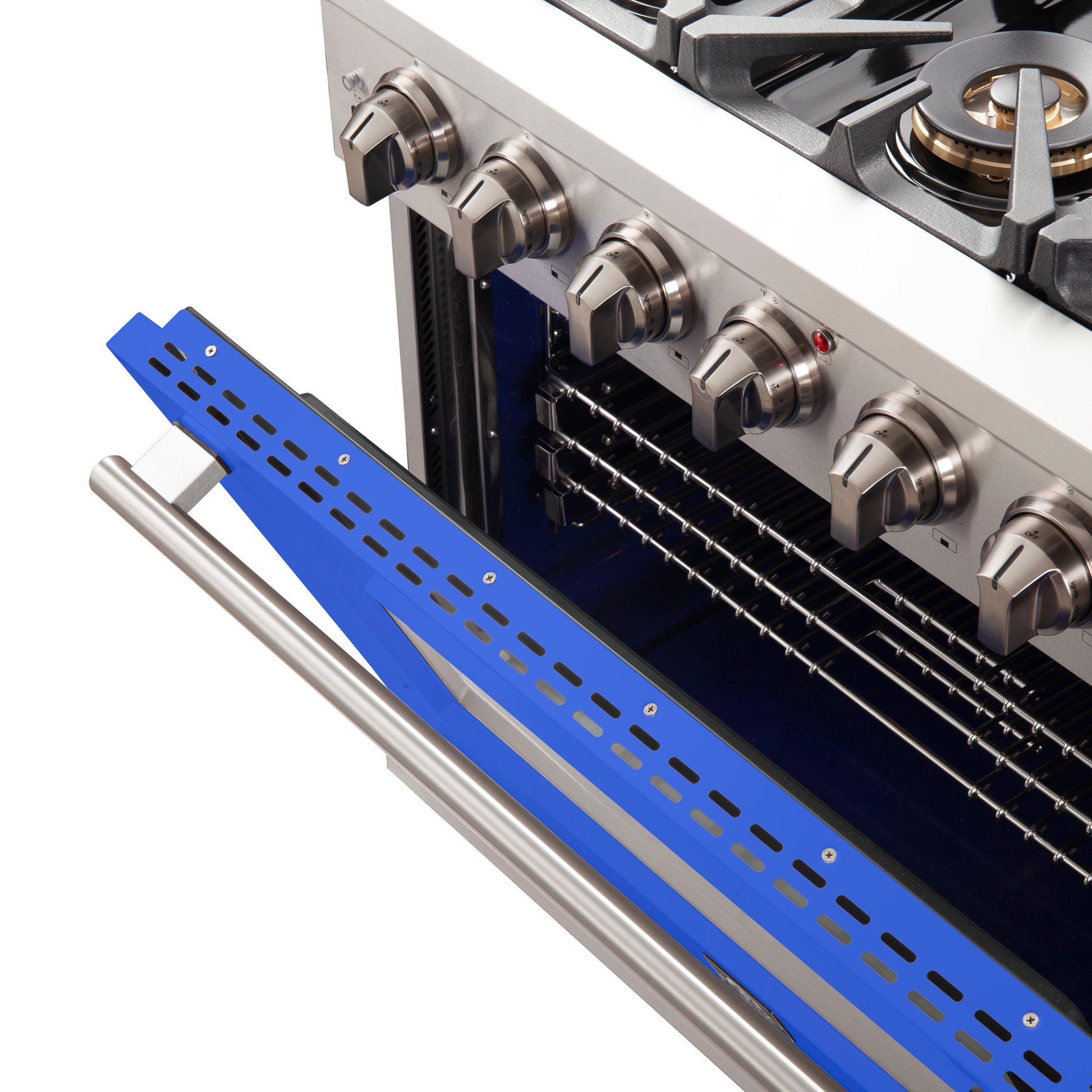 Forno Capriasca 36-Inch Gas Range, Stainless Steel, 6 Brass Burners, 120,000 BTU, Convection Oven, Energy Efficient, Blue Door