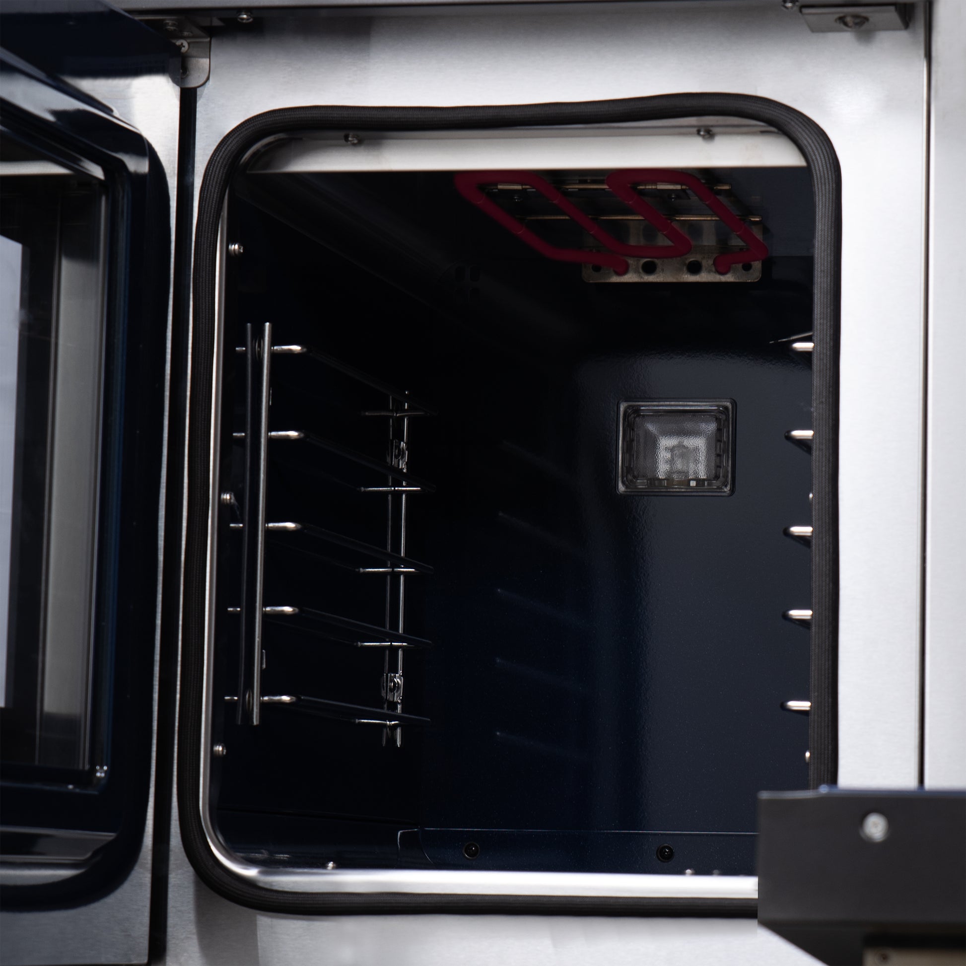 * French Door Design: Simplifies loading and unloading large dishes, improves oven accessibility, and reduces the risk of burns