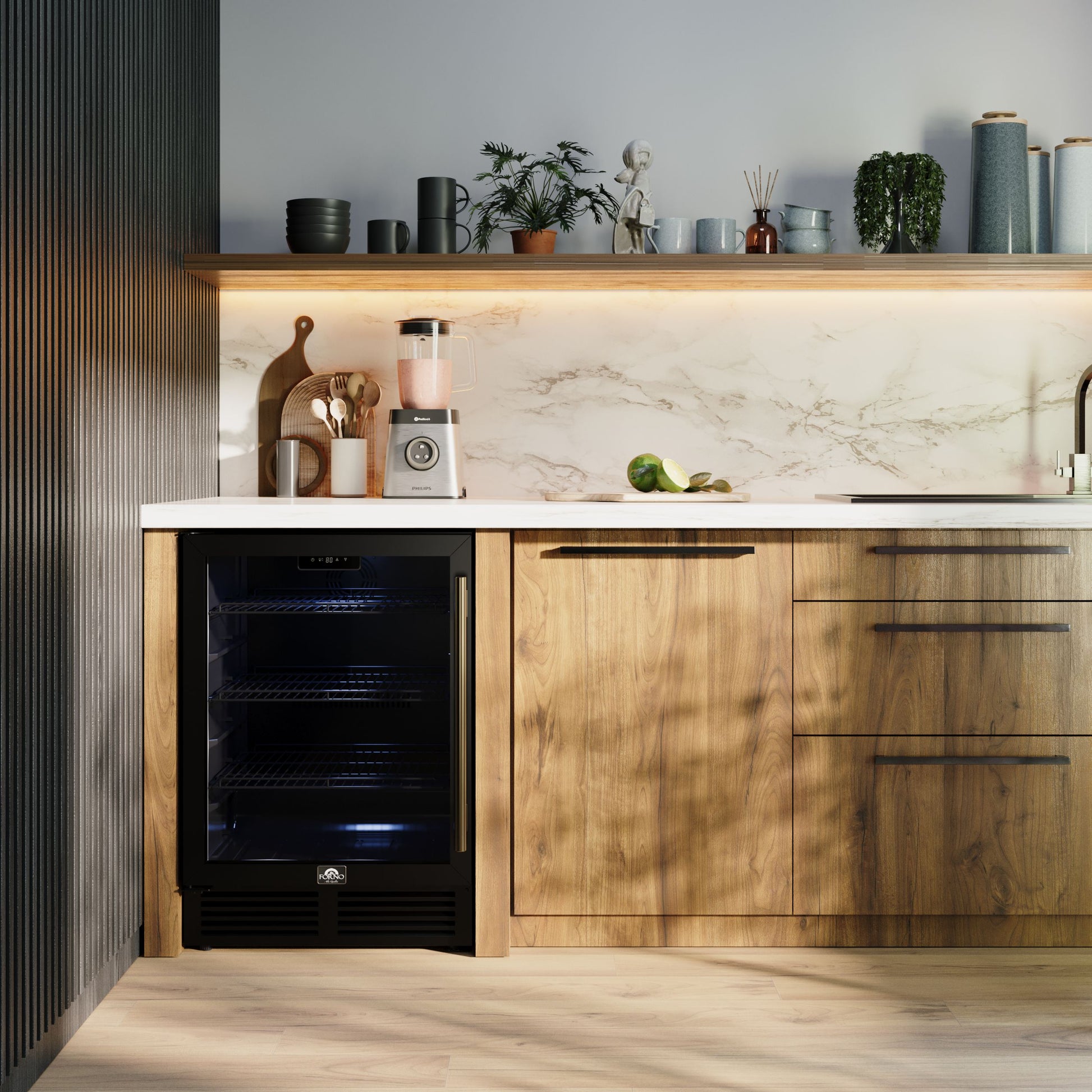 Forno Frescolino 24 Inch Beverage Cooler, Black with Antique Brass Handles, with LED Lighting, Triple Glass Door, 188 Can Capacity, Built-In or Freestanding