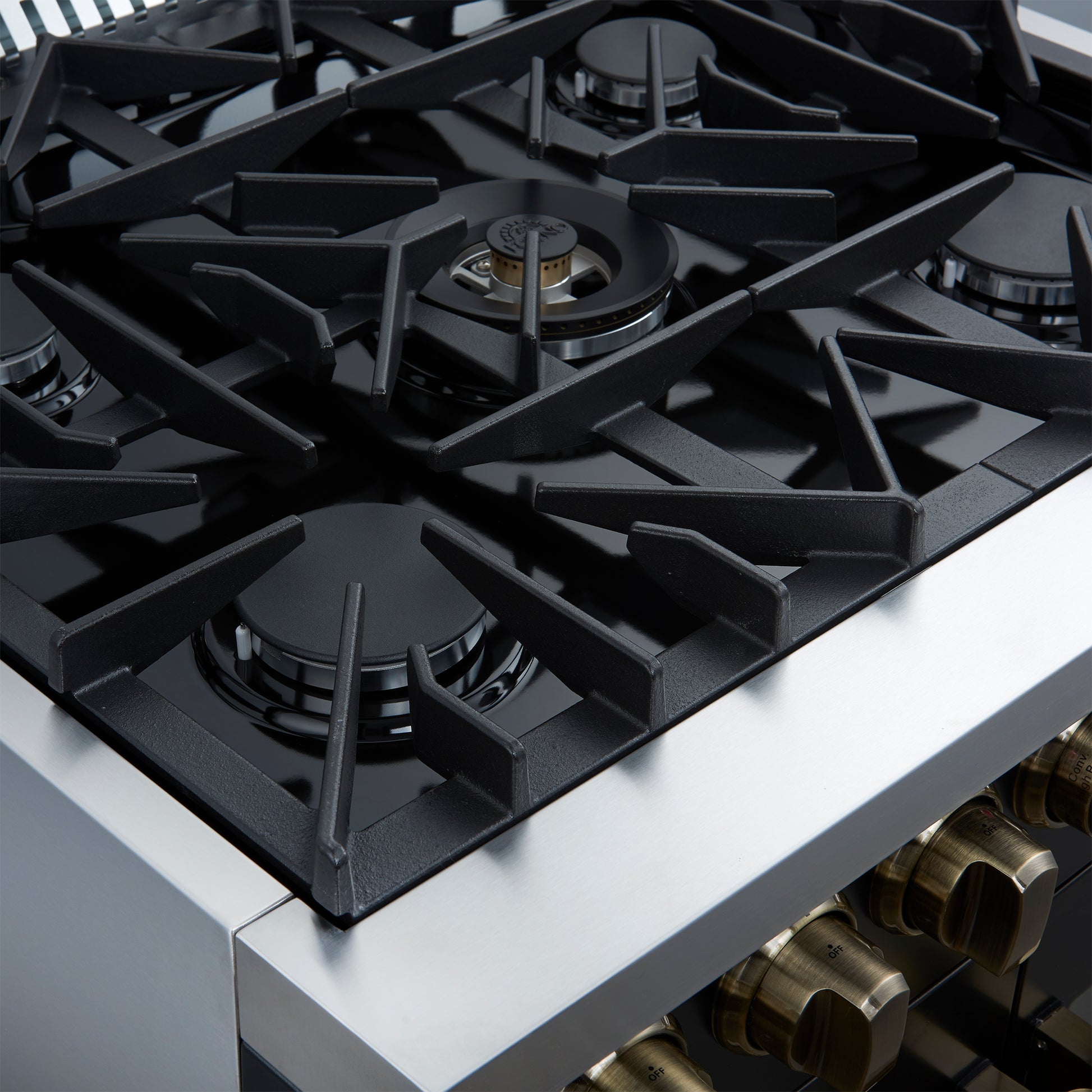 * Continuous cast iron grates for stability and smooth pan movement.