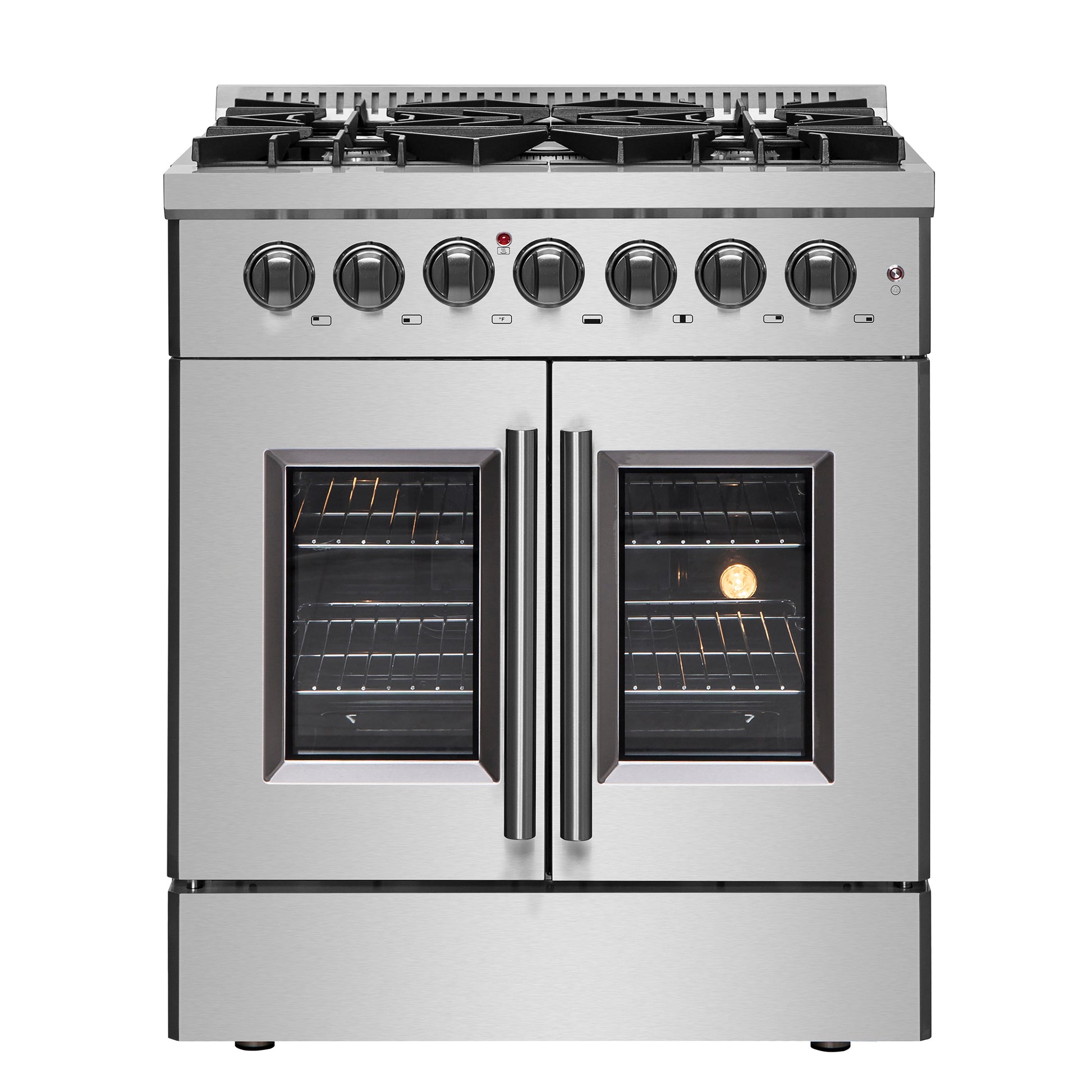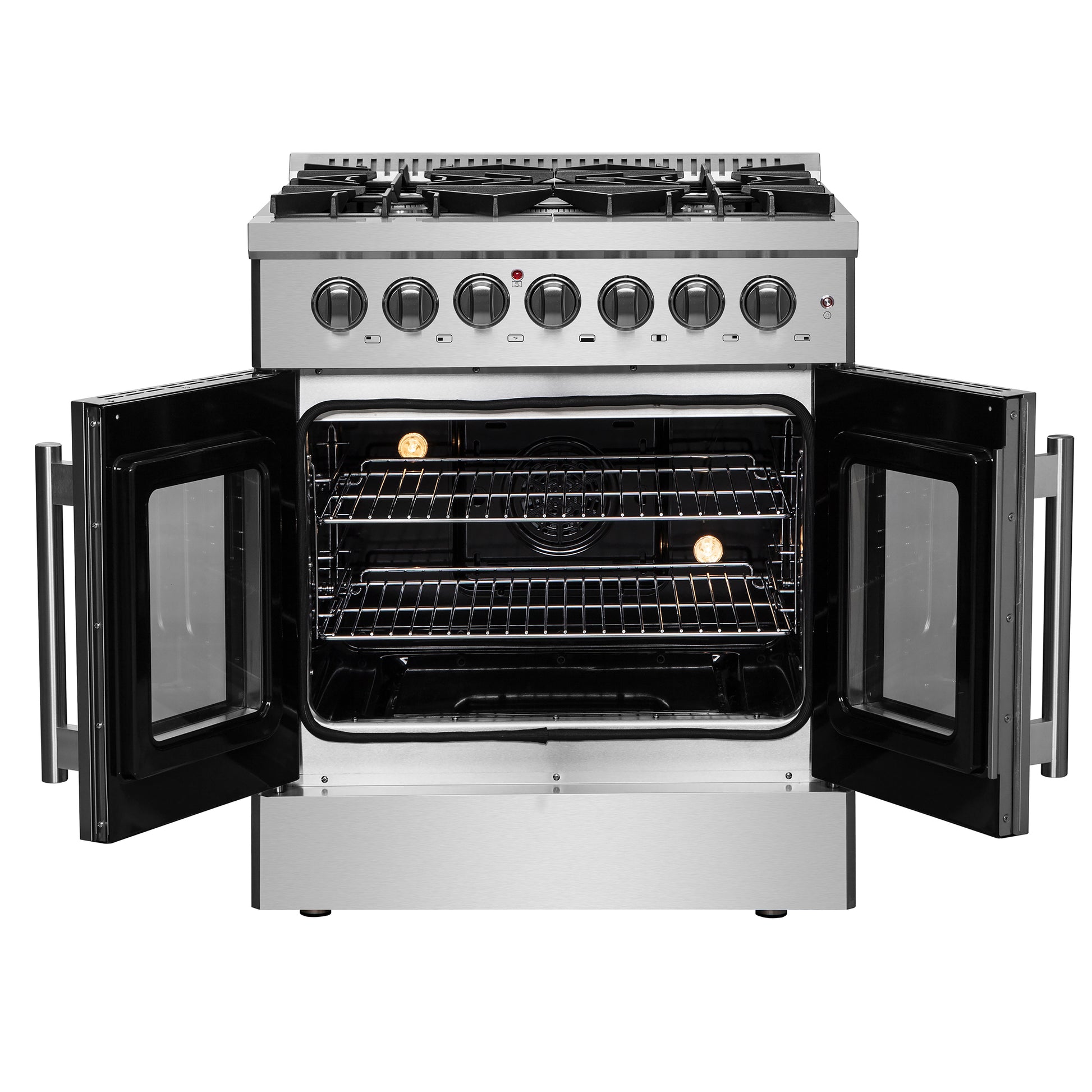 Our 30" Galiano Dual Fuel French Door Range blends timeless design and high performance. This range adds sophistication to any kitchen at an affordable price. The cooktop boasts five sealed burners with a total output of 68,000 BTU, including a 20,000 BTU dual-ring burner ideal for boiling, searing, or simmering delicate sauces. The heavy-duty cast iron grates provide a stable surface and allow you to slide cookware effortlessly across the cooktop. Its spacious 4.32 cu.ft. true convection oven delivers even heat distribution, powered by 6,300 watts, for perfectly baked and roasted dishes. Easy-to-clean black enamel interiors, French door convenience, and included electroplated racks make this range as practical as it is beautiful. Complete with an LP conversion kit and NEMA 14-50 power cord, the Galiano Range is built for both style and efficiency.