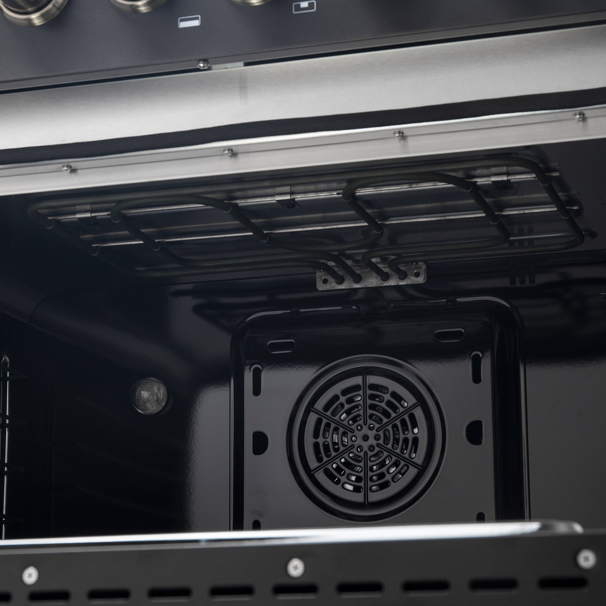 * The sleek black front, paired with antique brass knobs and handles and stainless steel surroundings, creates a bold and sophisticated centerpiece.