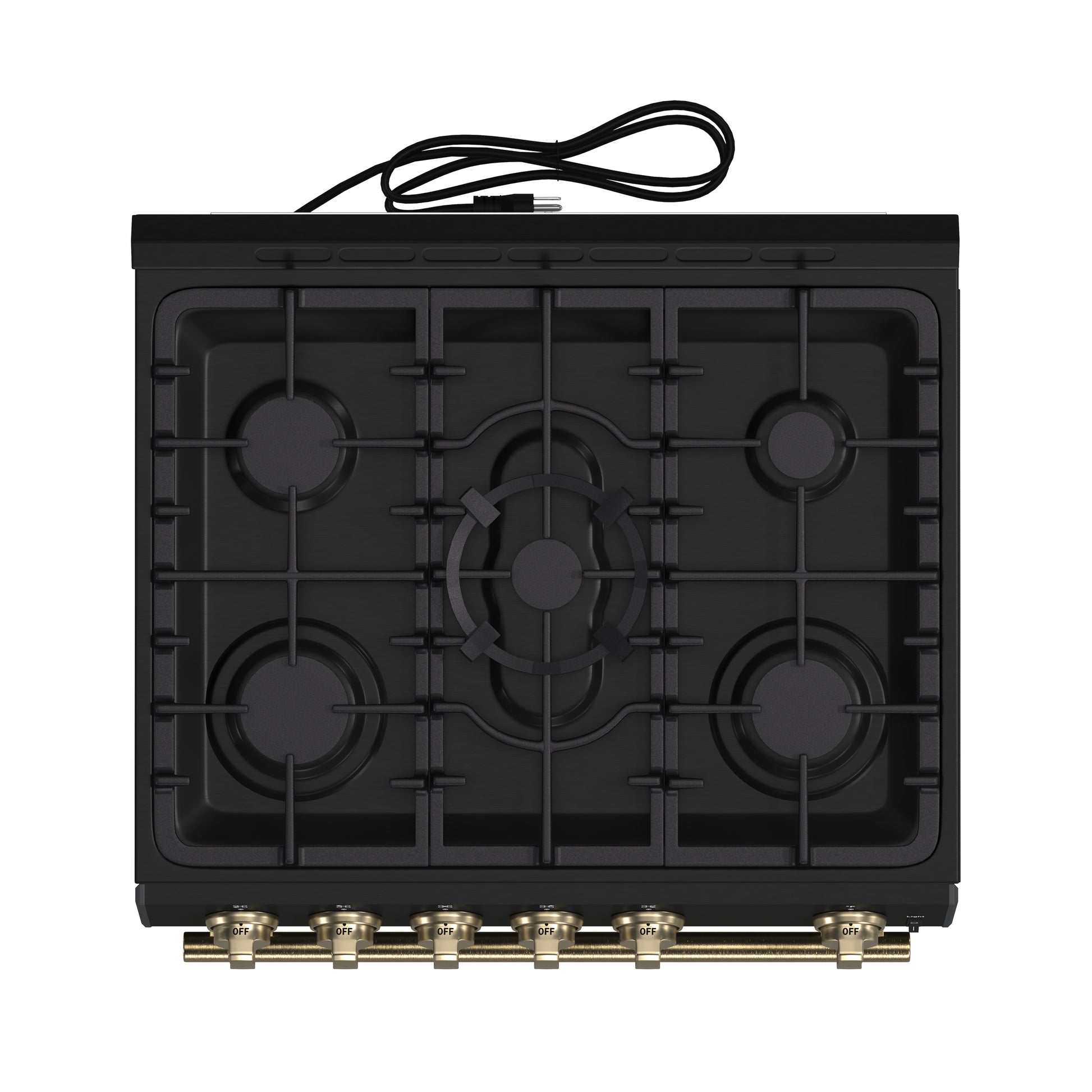 * The deep recessed cavity of the black enamel range top is designed to contain spills, allowing for quick and easy clean-ups.