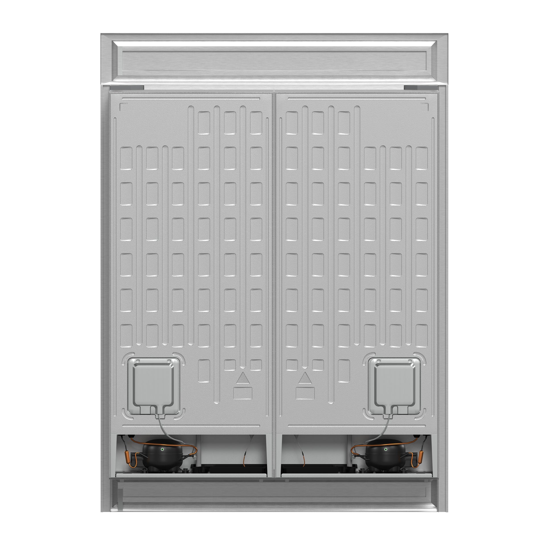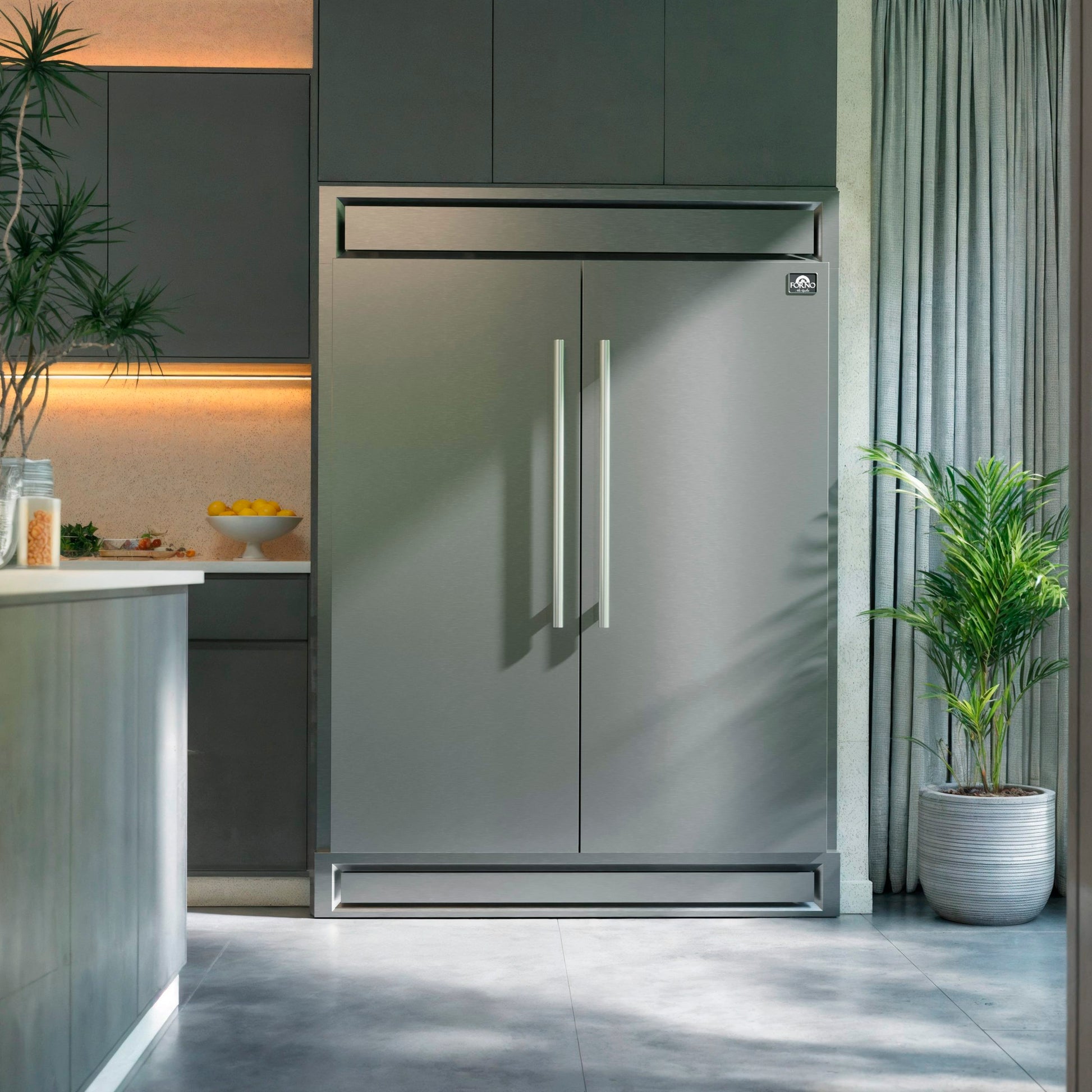 The Forno Maderno combines two 28 Inch refrigerators with decorative trim grill, extending to a 60 Inch width for a built-in appearance, harmoniously blending style with convenience. This combo offers ample storage space totaling 27.2 cu.ft. They feature customizable cooling with convertible function and total no frost technology, eliminating tedious defrosting. The side-by-side door design integrates seamlessly, while elegant glass shelves with silver trim and practical plastic door balconies enhance appeal and storage. Effortlessly switch between Fahrenheit and Celsius, aided by LED lighting for easy item location. Six glass shelves and six plastic drawers with silver trim provide flexible storage, and temperature settings are easily managed with the electronic touch control panel. The VCM door panel and metal back ensure durability, and the combo is T Climate Class certified with an E-star energy rating for sustainability.