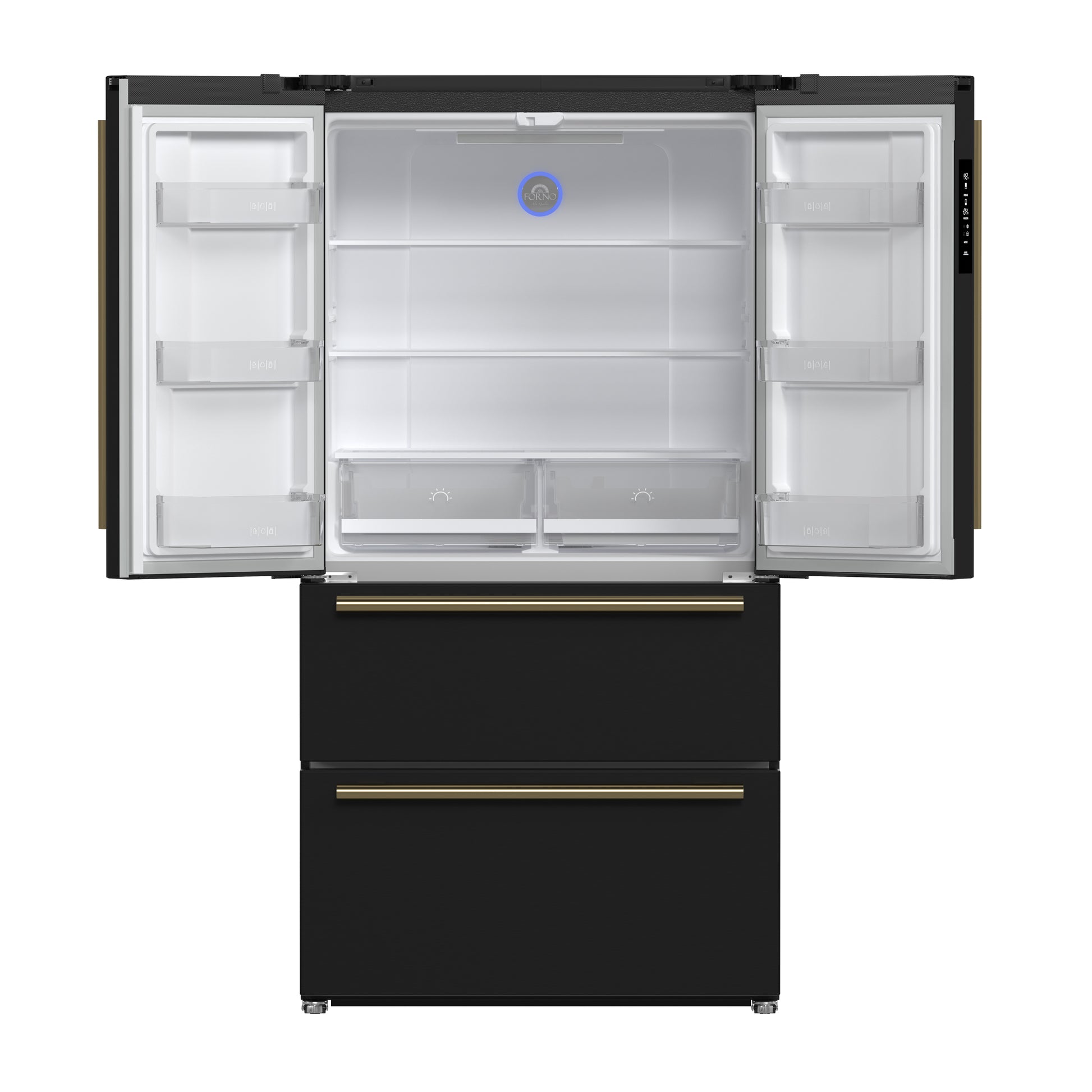Upgrade your kitchen with the Forno Moena 36" Built-In French Door Refrigerator in black with antique brass handles, designed for seamless integration and premium performance. Powered by a high-efficiency inverter compressor, it ensures energy savings, quiet operation, and precise temperature control to keep your food fresher for longer. The frost-free multi-airflow cooling system maintains consistent temperatures throughout its 19.2 cu. ft. capacity, providing optimal food preservation with adjustable shelving for versatile storage. The 12.1 cu. ft. fresh food section includes three glass shelves (two adjustable), two drawers, and generous door storage to keep groceries organized. The 7.2 cu. ft. freezer offers two pull-out drawers, a slide-out tray, and an automatic ice maker producing up to 4 pounds of ice daily, ensuring convenience for every occasion. With an intuitive LED touch panel, you can effortlessly control temperature settings and functions. Energy Star Certified, this built-in French door refrigerator operates efficiently while minimizing food spoilage with bright, high-efficiency LED lighting for superior visibility.