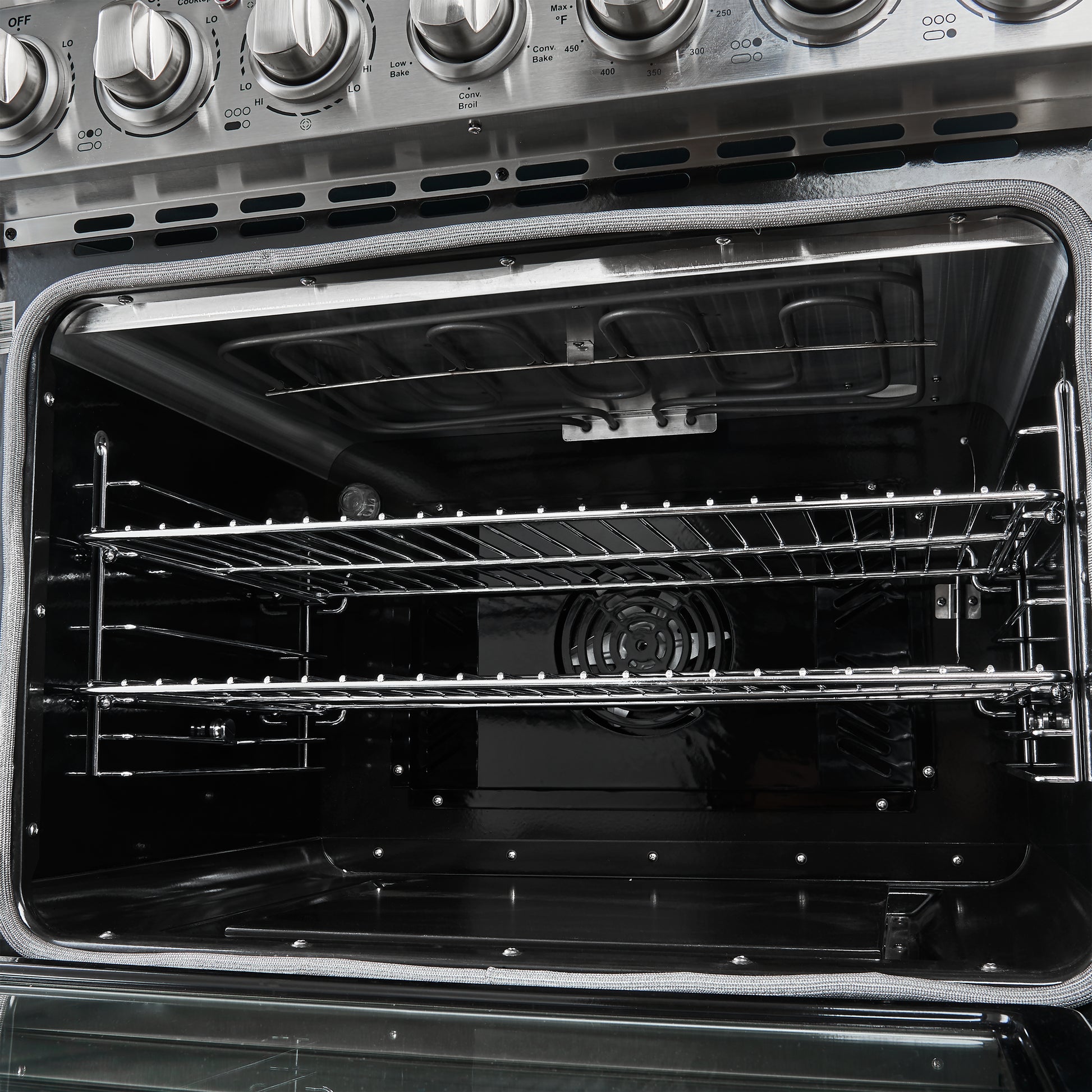 * The 4.38 cu.ft. black enamel oven features true convection with a 1,200-watt element, providing consistent heat for even baking, and a total bake and broil output of 3,800 watts.