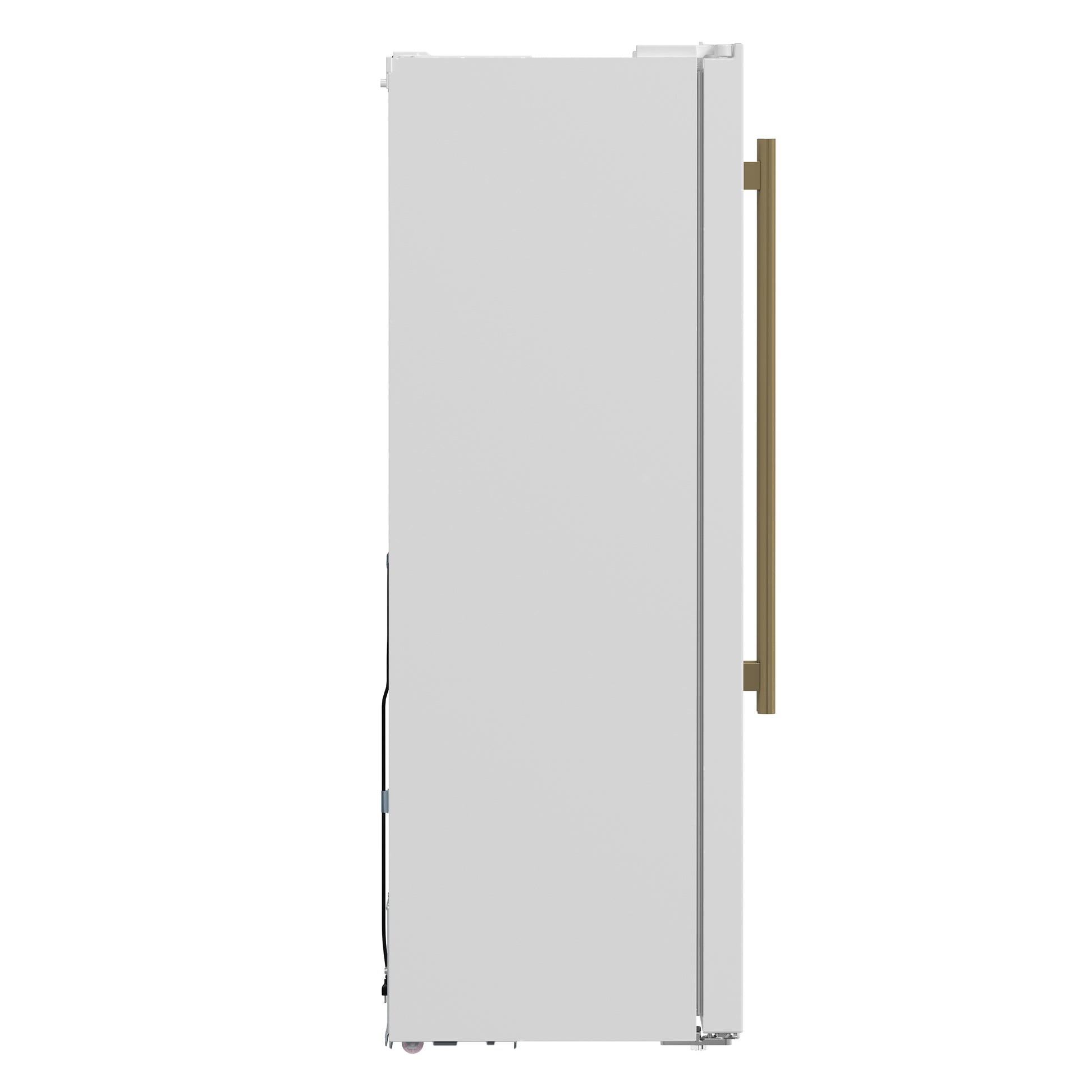 * Sleek white-finished doors with antique brass handles provide a stylish and customizable option.